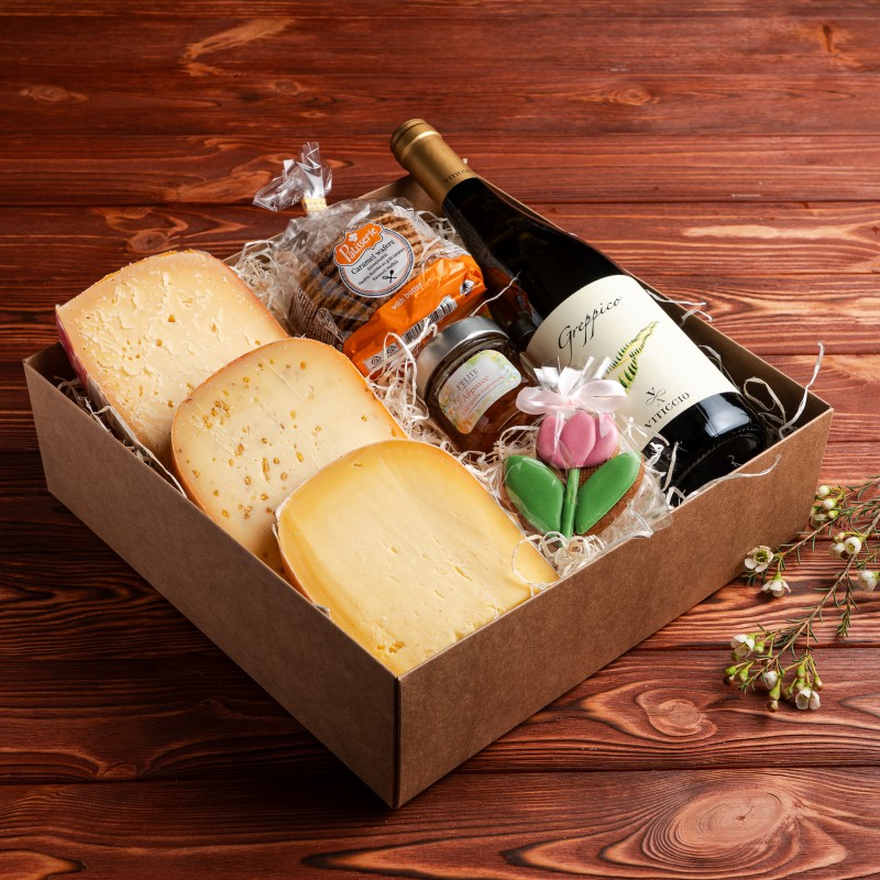 Світлий весняний набір для приємного вечора або неспішних вихідних: три витримані сири — Grandano Vecchio, вершковий Джерсі та Хутірський із пажитником — у парі з сухим білим вином Fattoria Viticcio Greppico. До сирів — абрикосовий джем із лагідним тархуном та голландські карамельні вафлі. А святковий пряник “тюльпан” додає настрою першого весняного проміння.