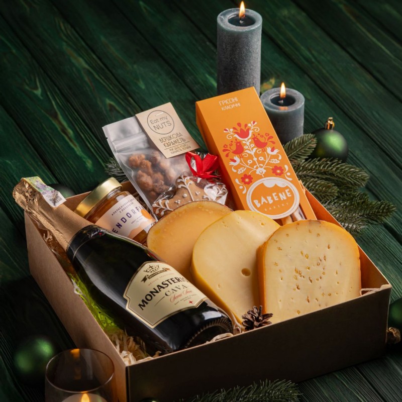 Щось святкове й витончене, з добірними сирами у дуеті з ігристим вином, горіховими ласощами та пряними нотами різдвяного печива.
